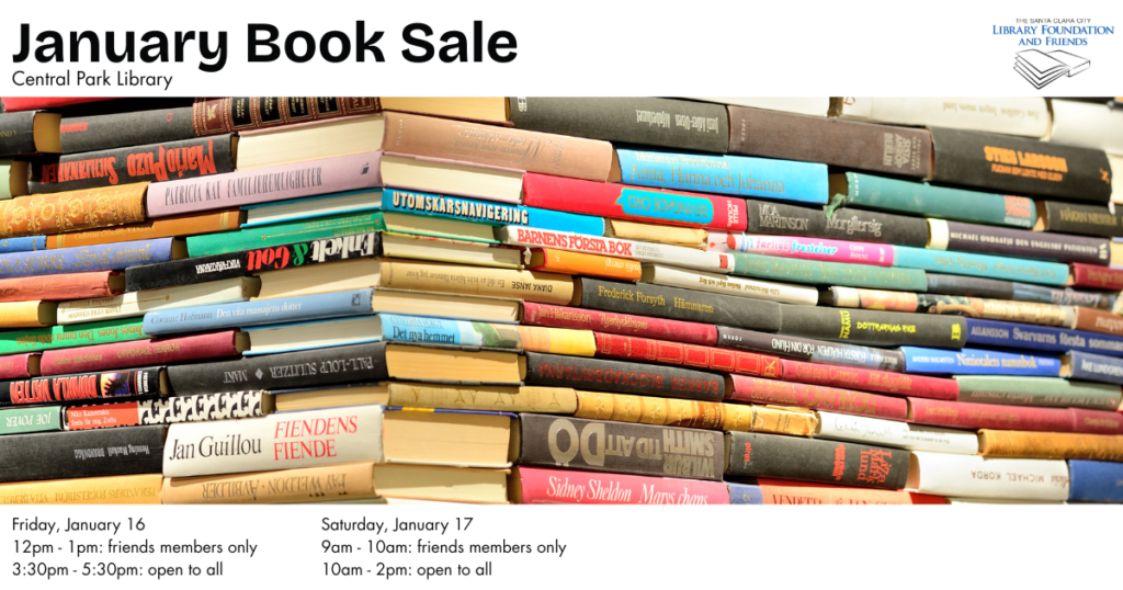 Our next book sale at Central Park Library will be on Friday, January 16 from 3:30 PM to 5:30 PM and Saturday, January 17 from 10 AM to 2 PM